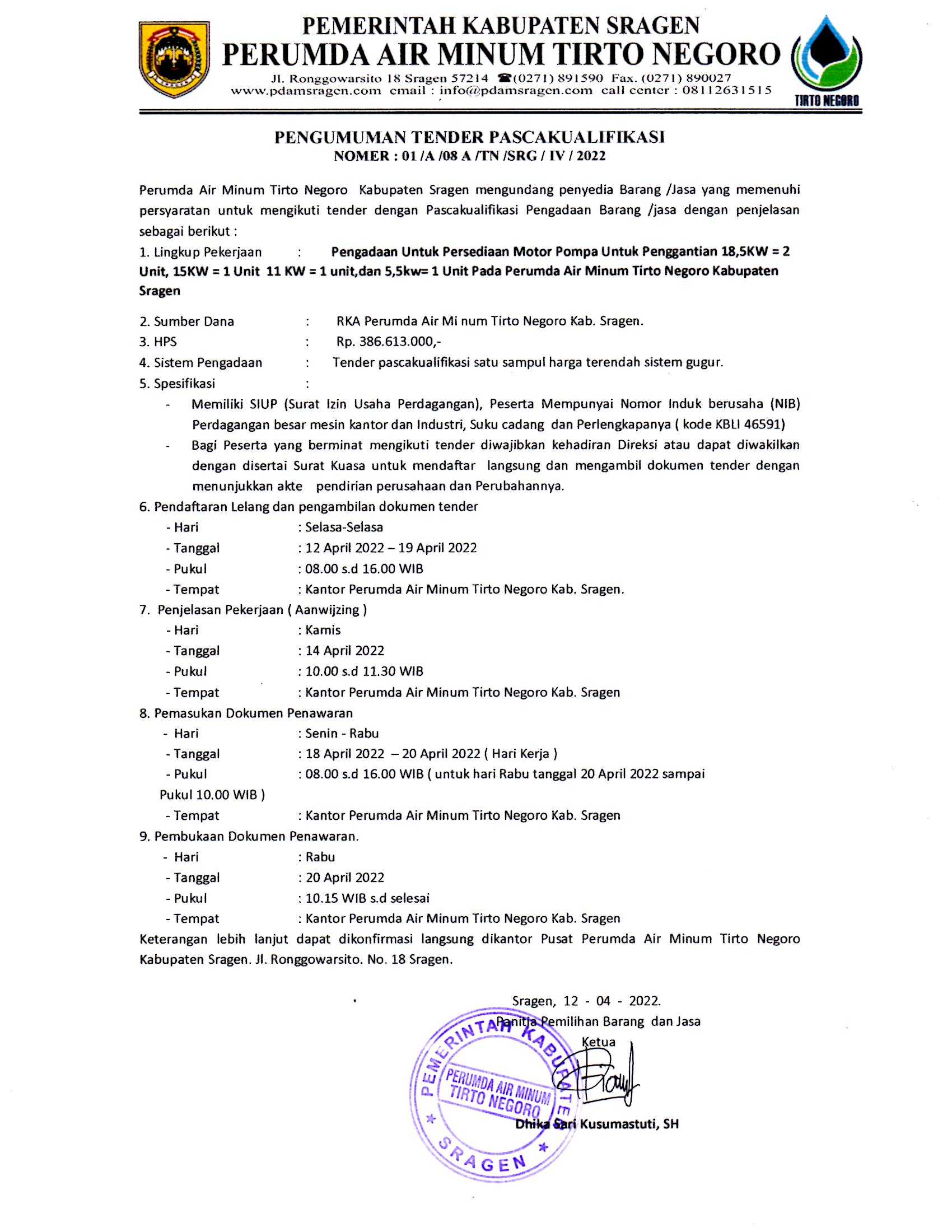 PENGUMUMAN TENDER PASCAKUALIFIKASI 12 April 2022 | Tidak ada komentar Pengadaan Untuk Persediaan Motor Pompa Untuk Penggantian 18,5 KW = 2 Unit, 15 KW = 1 Unit, 11 KW = 1 Unit, 5,5 KW = 1 Unit Post Views: 819 Lelang