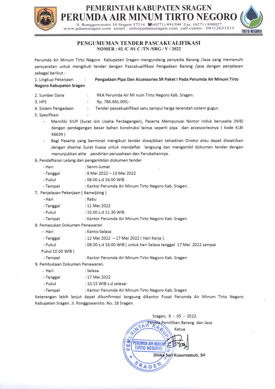 PENGUMUMAN TENDER PASCAKUALIFIKASI 9 Mei 2022 | Tidak ada komentar Pengadaan Pipa dan Accessories SR Paket I Post Views: 811 Lelang