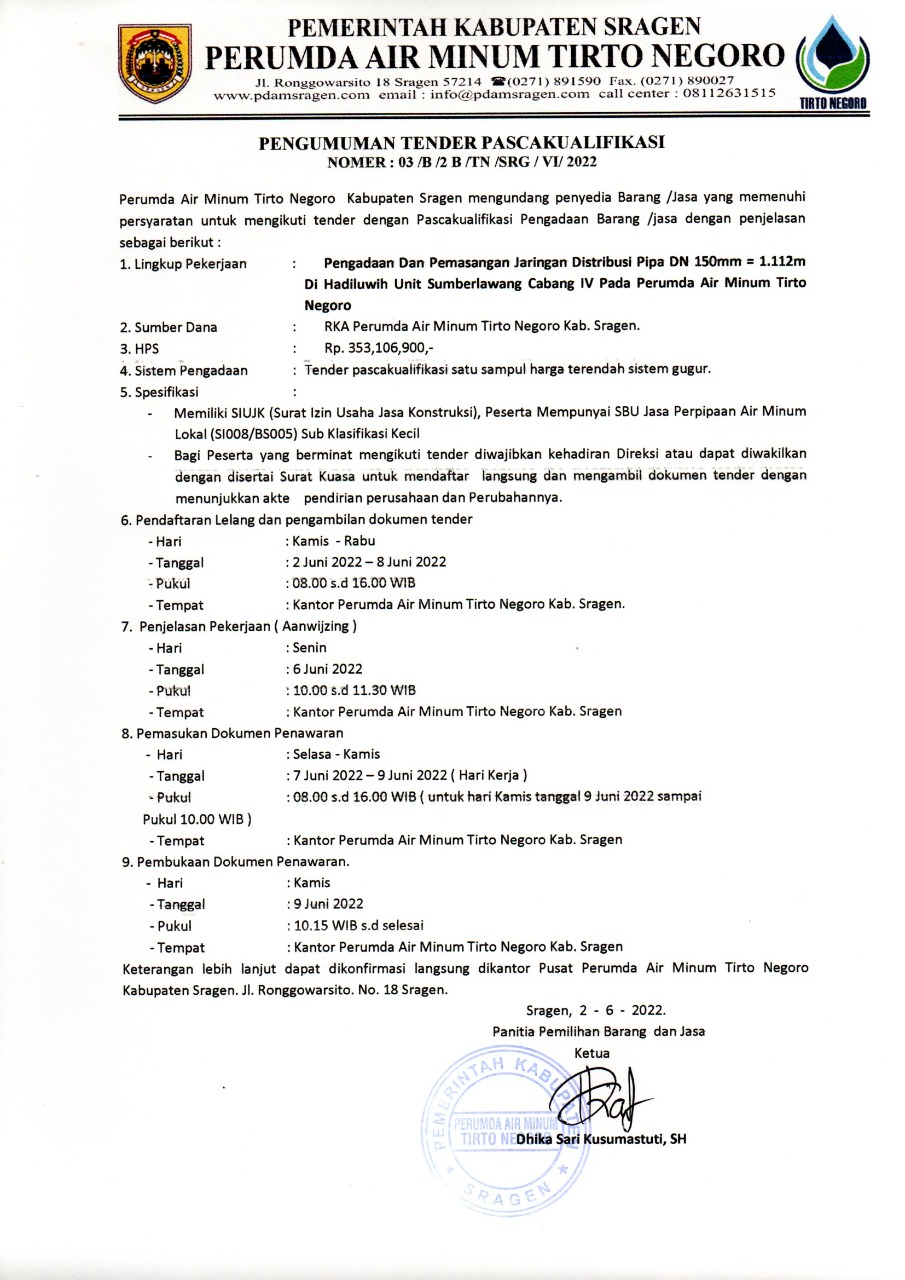 PENGUMUMAN TENDER PASCAKUALIFIKASI 2 Juni 2022 | Tidak ada komentar Pengadaan dan Pemasangan Jaringan Distribusi Pipa DN 150mm = 1112 m di Hadiluwih Unit Sumberlawang Cabang IV Post Views: 660 Lelang
