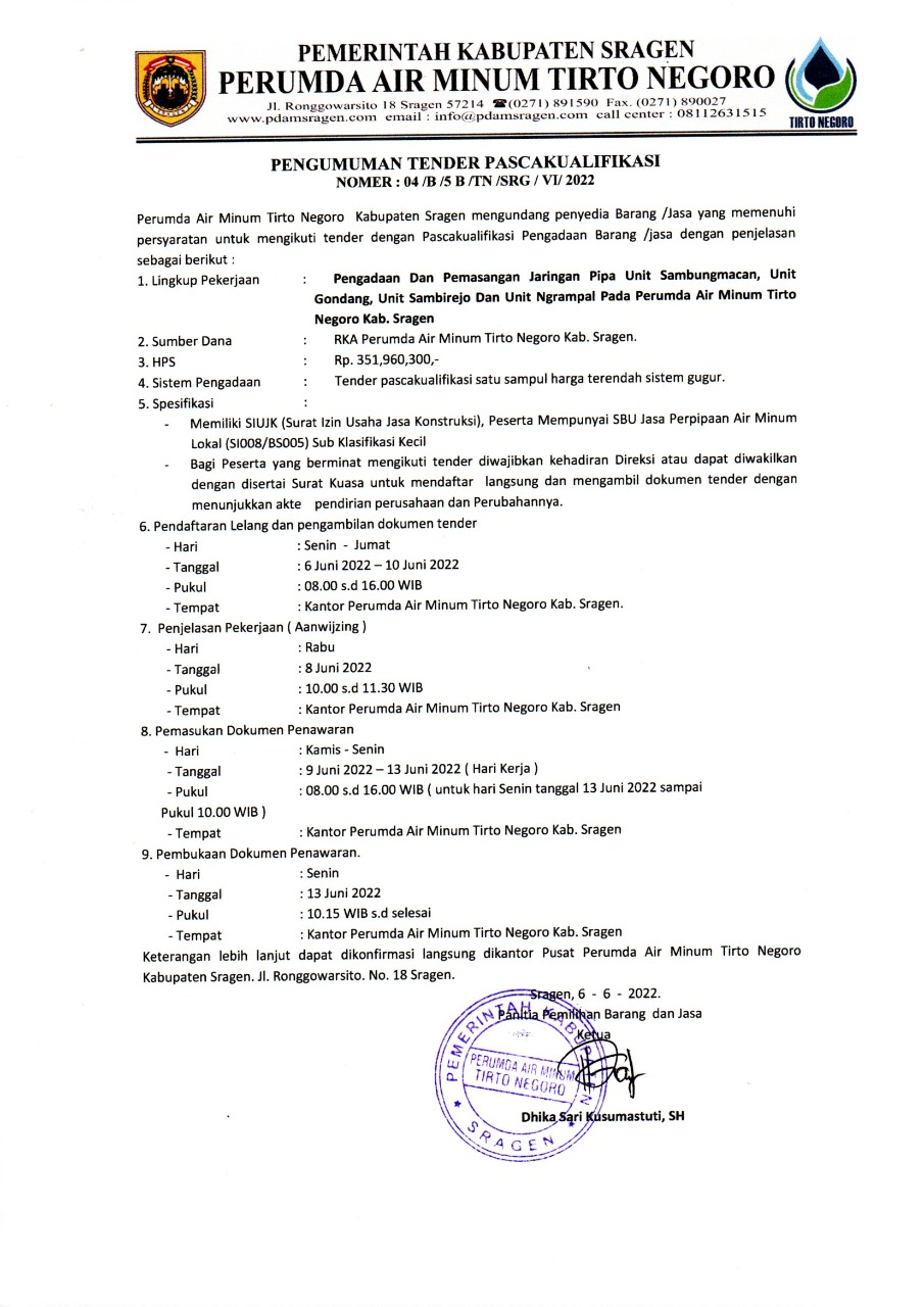 PENGUMUMAN TENDER PASCAKUALIFIKASI 6 Juni 2022 | Tidak ada komentar Pengadaan dan Pemasangan Jaringan Pipa Unit Sambungmacan, Unit Gondang, Unit Sambirejo, Unit Ngrampal Post Views: 734 Lelang